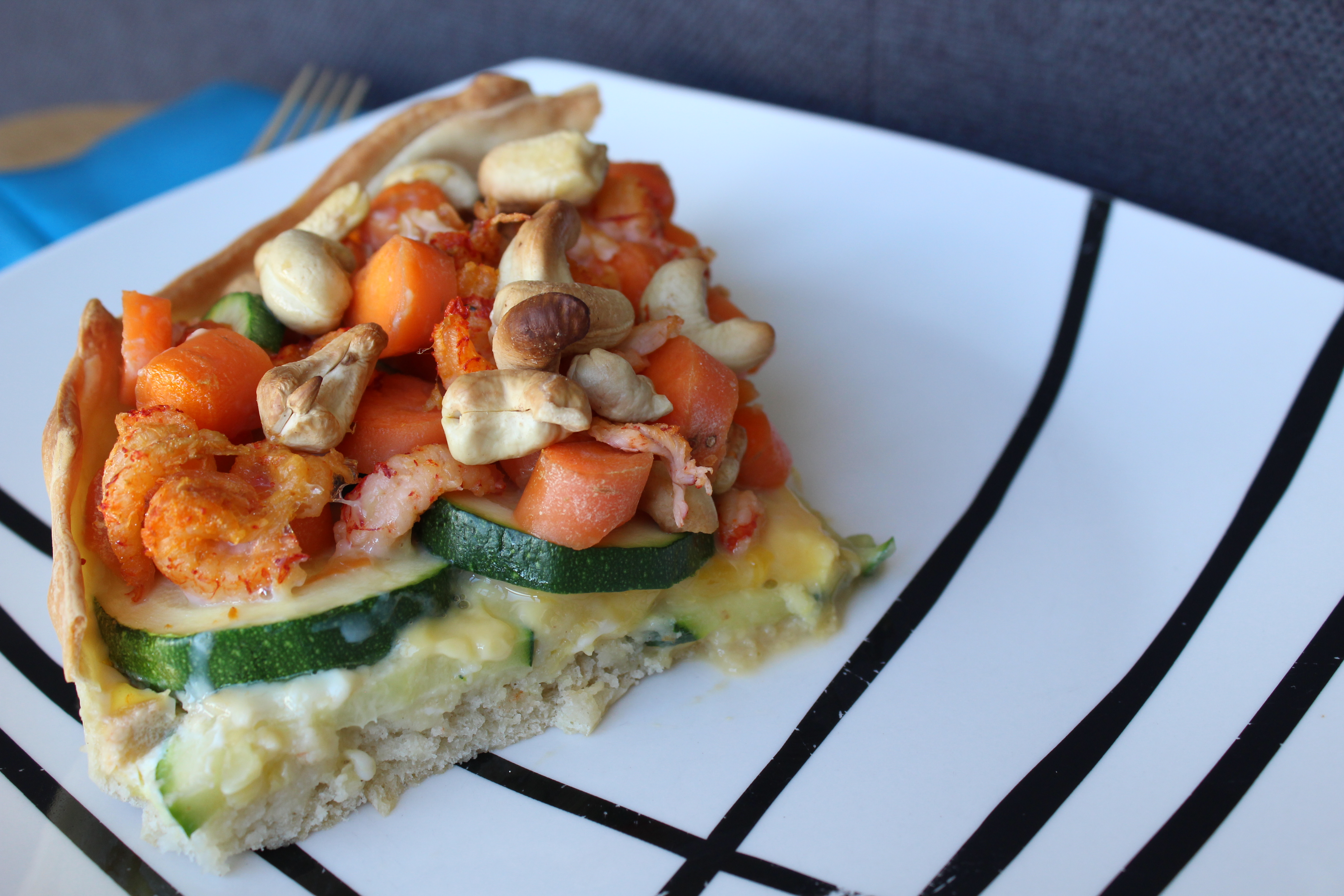 Doe een klein beetje olijfolie in een bakvorm en beleg deze met de plakjes hartige taartdeeg. Leg vervolgens de courgette in de bakvorm. Daarop leg je de wortels en de rivierkreeftjes. Kluts de eieren, roer de crème fraîche erdoor, doe er zout en peper bij en giet het mengsel over de ingrediënten in de bakvorm. Strooi er wat rauwe cashewnoten over en zet in de oven. Bak de hartige taart in ongeveer 40 minuten gaar.