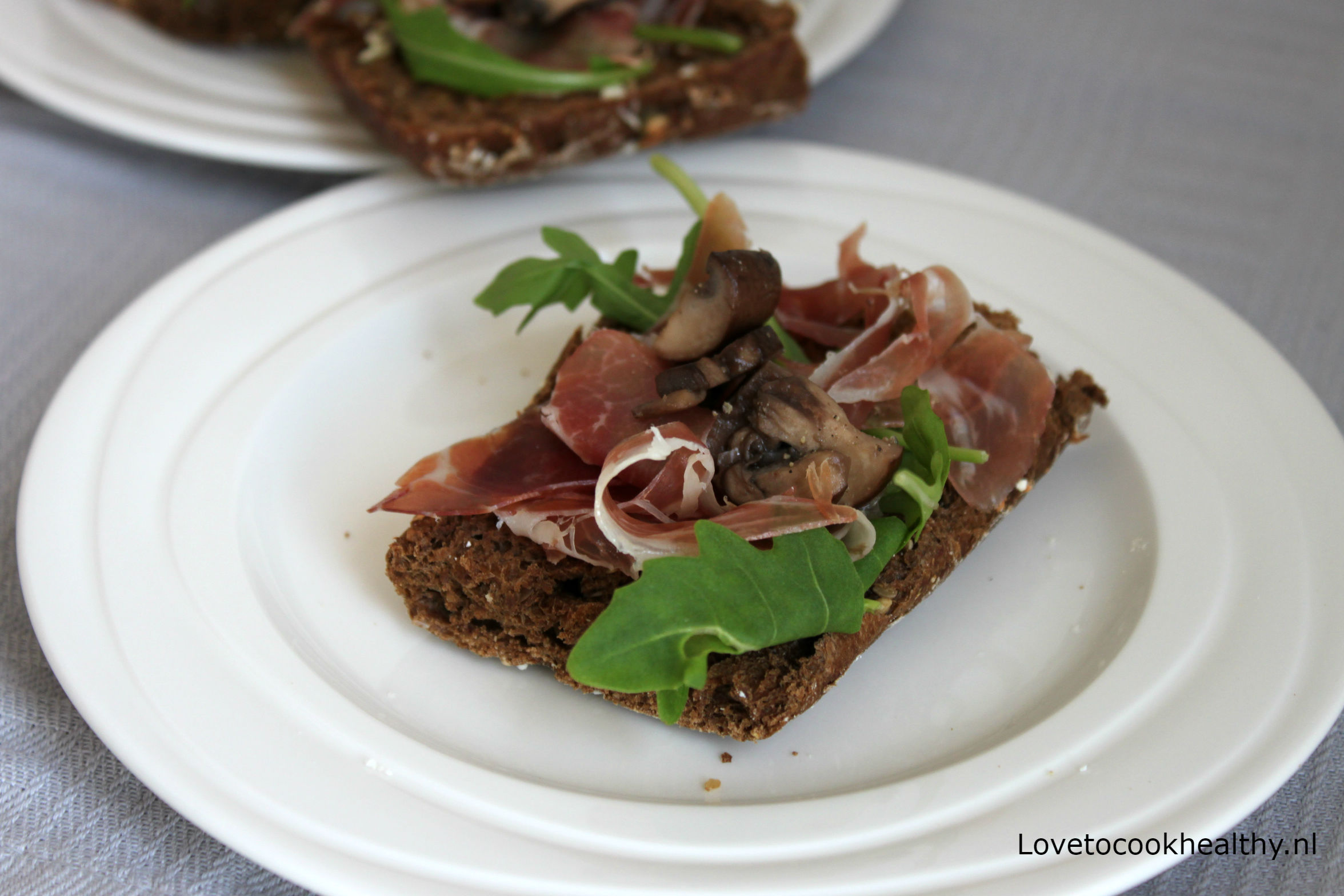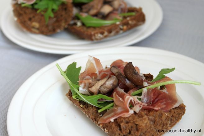 Besmeer de binnenkant van ieder broodje met wat boter en beleg vervolgens met rucola, Serrano ham en de champignons. Maak eventueel nog wat op smaak met extra zout en peper.