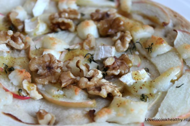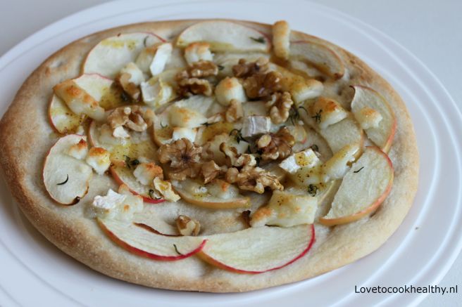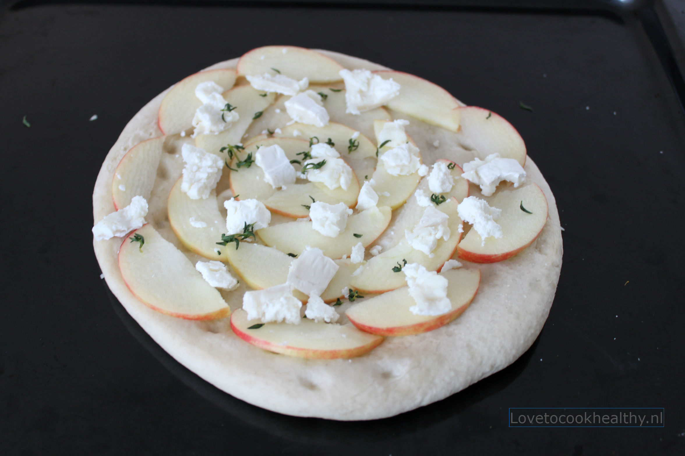 Snijd de appel in dunne plakjes en beleg de pizza hiermee. Kruimel de geitenkaas over de appel en bestrooi de pizza met wat tijm.