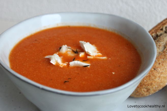 Doe nu de paprika, bloemkool, water en bouillonblokjes in de pan, breng aan de kook en laat ongeveer 25 minuten pruttelen tot de bloemkool gaar is. Pureer de soep glad en serveer met wat geitenkaas en tijm. Eet smakelijk!