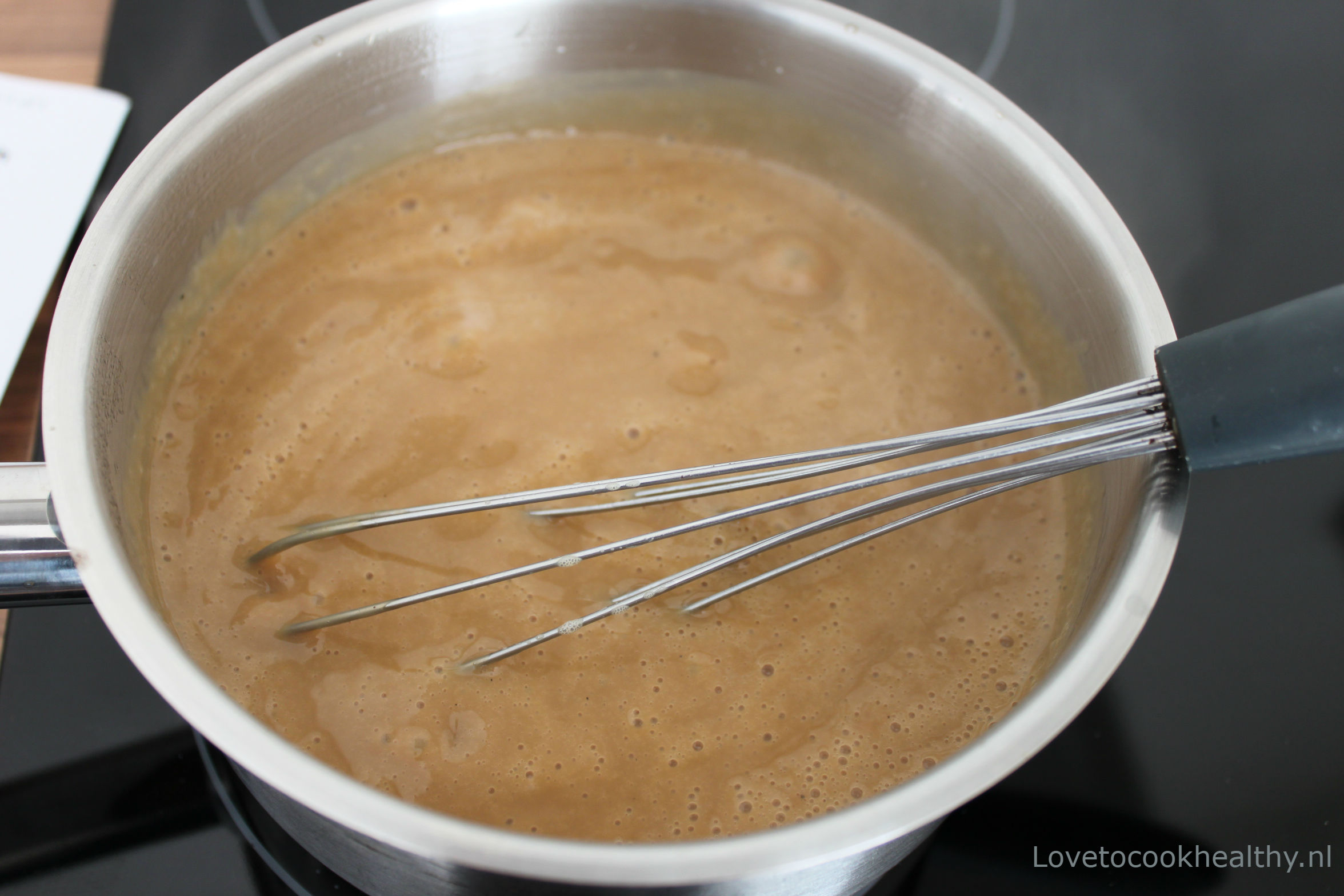 Zet een pan op het vuur en breng met een garde de melk, suiker en maizena al roerend aan de kook. Laat ongeveer 3 minuten koken en blijf ondertussen roeren.