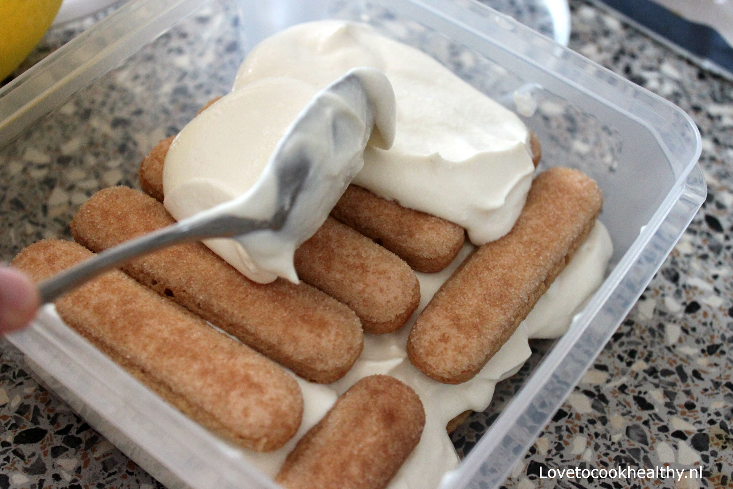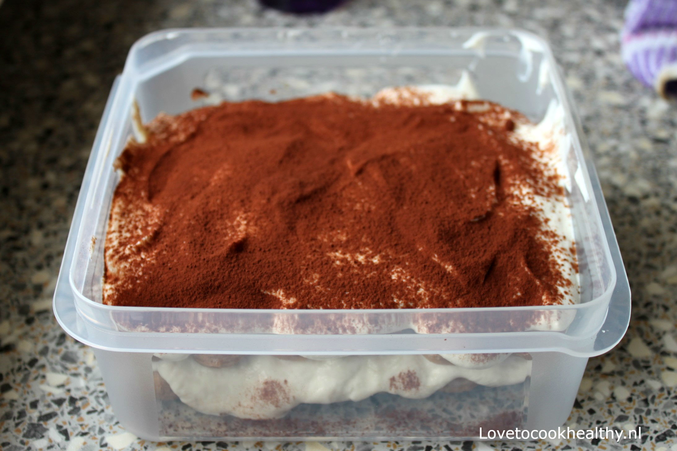 Dek de bak/schaal af en zet de gezondere tiramus gedurende 3 uur in de koelkast.
