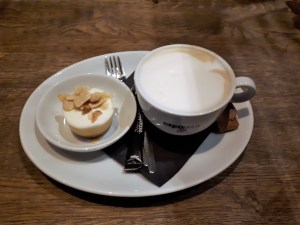 We hadden geen ruimte meer voor een dessert, dus kozen we voor koffie met een mini taartje. Dit was de perfecte afsluiting van het diner.