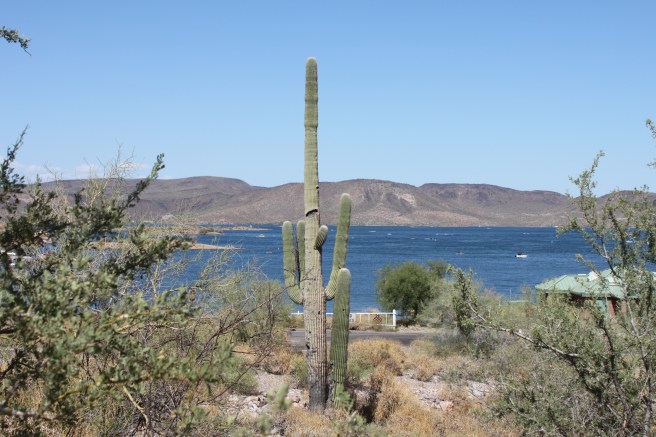 Niet veel later staan we op een mooi plekje met uitzicht op het meer. Het is heerlijk weer en we besluiten te gaan zwemmen in Lake Pleasant. Het is druk aan het meer, maar niet vervelend druk en iedereen dobbert voorbij op opblaasbootjes. ’s Avonds zitten we lekker lang buiten.