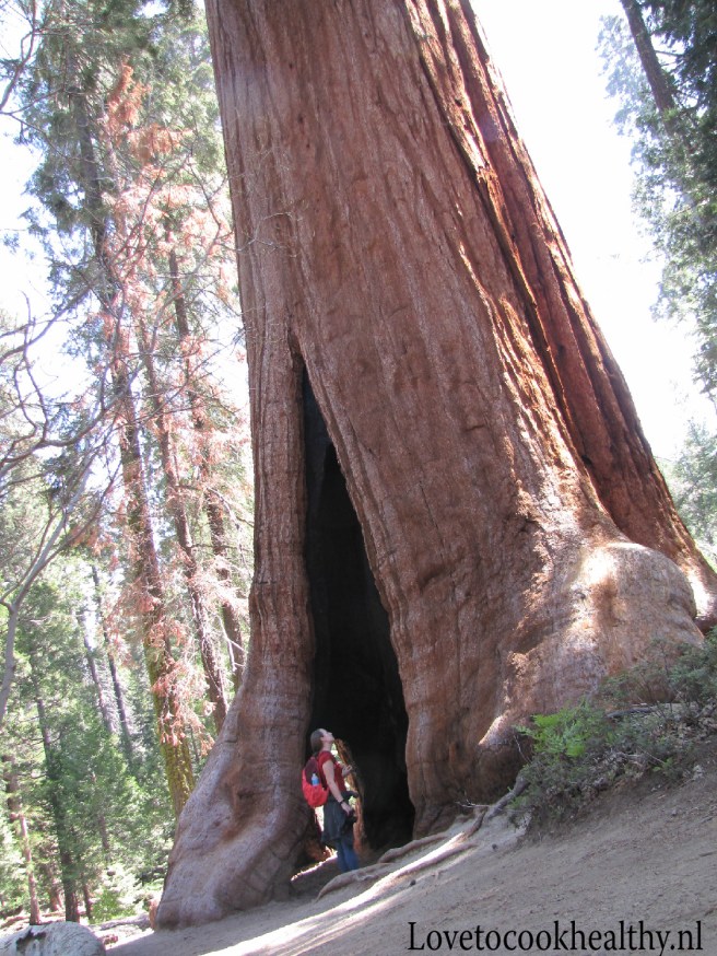 Na ons ontbijt rijden we als echte Amerikanen door de drive thru van Starbucks en gaan met onze koffie in de drankjeshouder op weg naar Sequoia National Forest. Volgens de weersvoorspellingen is het daar koud, dus ik heb een lange broek en trui aan getrokken. Onze GPS heeft wat moeite met het vinden van de weg en wanneer hij ons over een onverharde weg wil sturen, besluiten we om te keren. Uiteindelijk zien we toch het bordje en beginne we aan de Trail of 100 Giants. Het is prachtig om deze grote Sequoia bomen te zien en we maken veel foto’s.