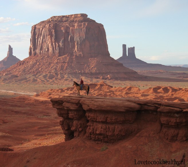 ’s Ochtends drinken we eerst koffie bij de Yavapai coffee shop bij Market Plaza en zoeken we wat dingen op Internet op. Daarna rijden we naar Monument Valley. Daar hebben we een kampeerplek gereserveerd op Goulding’s campground. We eten op tijd, want we moeten alweer vroeg klaarstaan voor de sunset tour in Monument Valley. We worden bij de receptie van de camping opgehaald door onze gids en samen met 6 andere mensen rijden we richting het park. De tour is erg leuk om te doen en we krijgen uitleg over de verschillende rotsformaties en namen. Na twee uur en vele foto’s later worden we weer afgezet bij de camping.