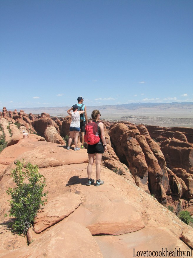 We lunchen bij de camper en rijden dan door naar Delicate Arch. Deze wandeling staat ook bekend als moeilijk en dat is een goede omschrijving. Er is weinig schaduw en vooral het begin is erg steil. We lopen in een lekker tempo door en eenmaal boven worden we beloond met een prachtig uitzicht!