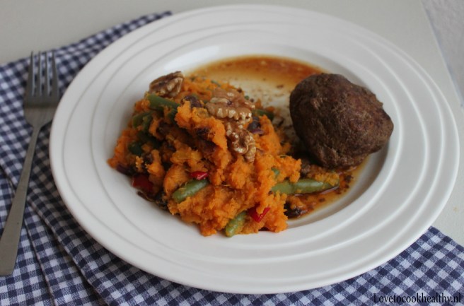 – Serveer de pittige stamppot met een gehaktbal en een handje walnoten.