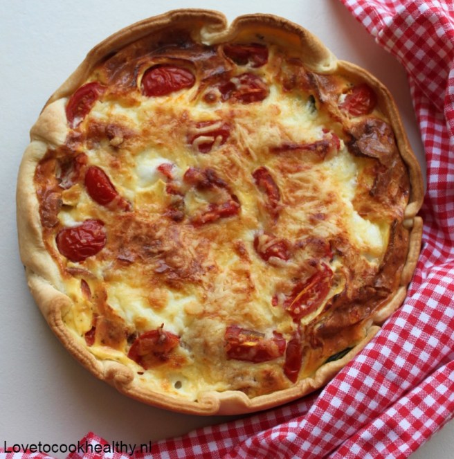 – Snijd de mozzarella in plakjes en verdeel deze samen de tomaatjes over de quiche.