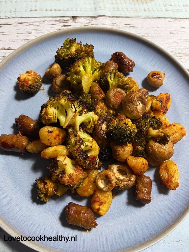 Vandaag heb ik weer een heerlijke traybake voor je. Er staan inmiddels al meerdere recepten op te site en ik blijf maar variëren met gnocchi en pesto in mijn traybake. Het voordeel van het gebruik van pesto in traybakes is dat je geen andere kruiden nodig hebt om de traybake een lekkere smaak te geven. Deze traybake met gnocchi, broccoli, champignons en chipolataworstjes heb je binnen vijf minuten in de oven en is super simpel om te maken.