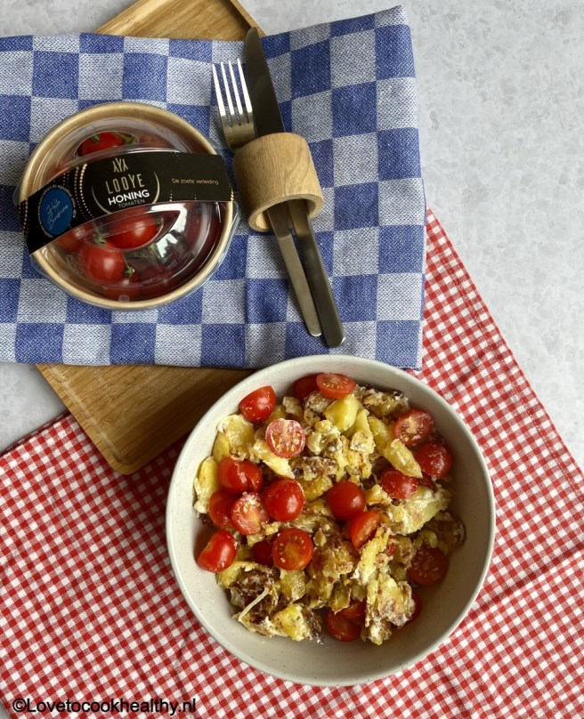 Deze crispy potato salad met honingtomaatjes maakte ik in samenwerking met Looye Honingtomaten en Green Food Lab.