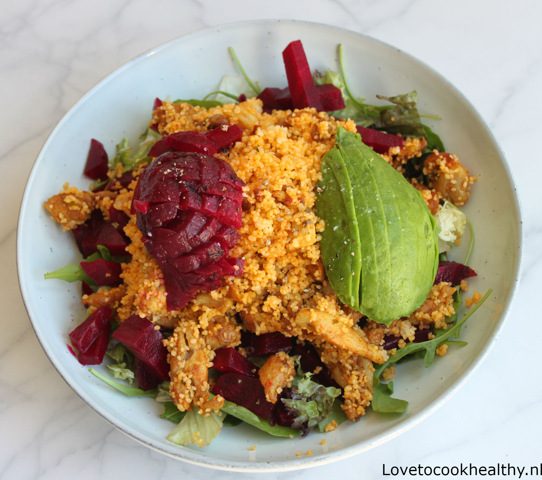 Deze couscoussalade met kipshoarma is een kleurrijke, mooie maaltijd die binnen no-time op tafel staat. Ideaal als je niet veel tijd hebt.
