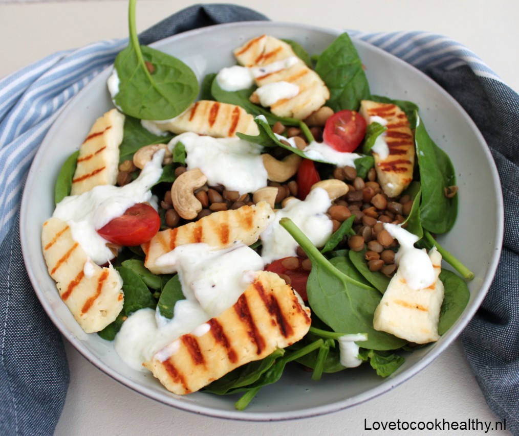 Deze spinaziesalade met halloumi is een heerlijke vegetarische maaltijd. Met maar 6 ingrediënten staat deze salade snel op tafel.