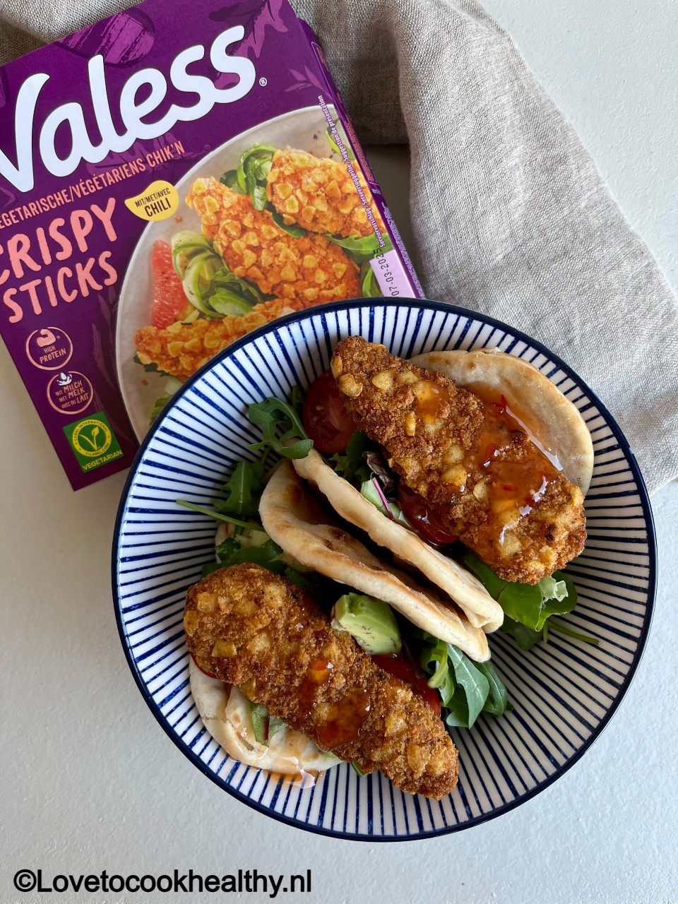Ik kreeg de vraag om voor de Nationale Week zonder Vlees en Zuivel (3 t/m 9 maart 2025) een recept te maken met mijn favoriete Valess-product. Ik koos ervoor om een vegetarisch (dus niet vegan) recept te maken met de vegetarische Chik’n Crispy Sticks met chili. Ik besloot de vegetarische Chik’n Crispy Sticks met chili te combineren met flatbread, sla, tomaatjes en avocado en een drizzle sweet chilisaus.