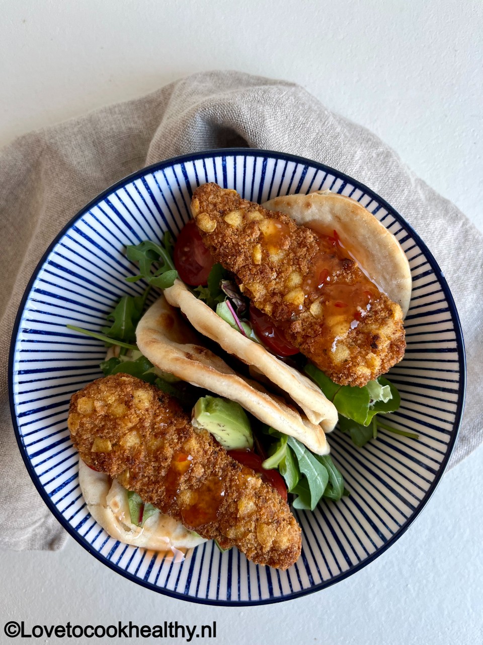 – Als de vegetarische Chik’n Crispy Sticks met chili klaar zijn, vul je de flatbreads met de sla, vegetarische Chik’n Crispy Sticks met chili, tomaatjes en avocado en maak ze af met een drizzle sweet chili saus.