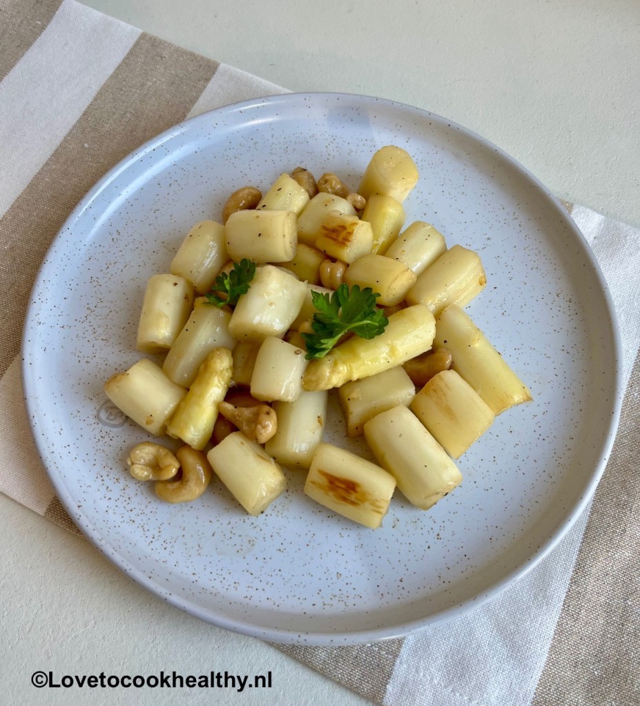- Voeg dan de asperges toe samen met de cashewnoten en wok ze tot de asperges gaar zijn.