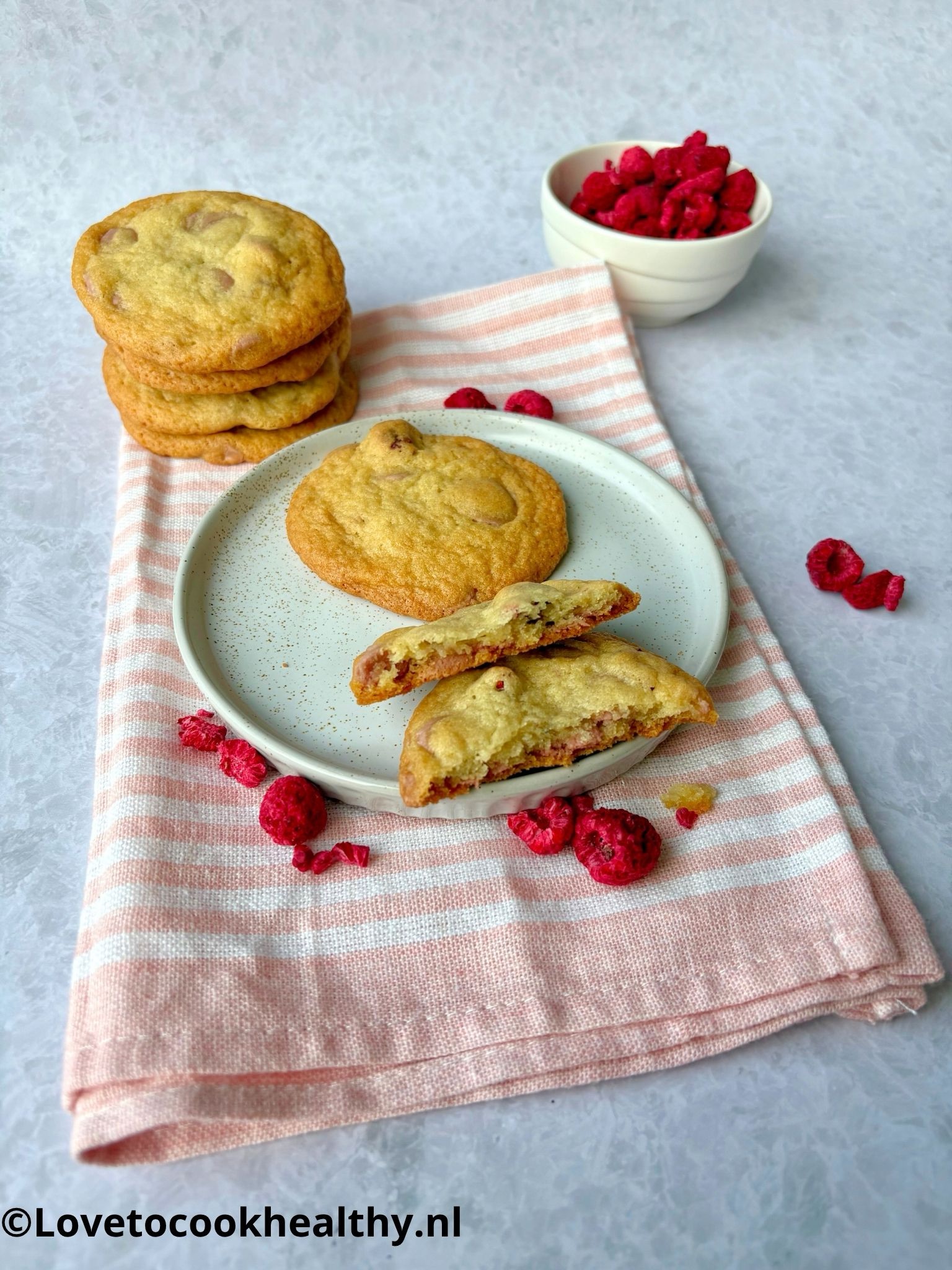 Deze chocolate chip cookies met ruby chocolade en gevriesdroogde frambozen maakte ik als last minute koffiekoeken klaar. Zowel de ruby chocolade als gevriesdroogde frambozen kreeg ik van de Noototheek.