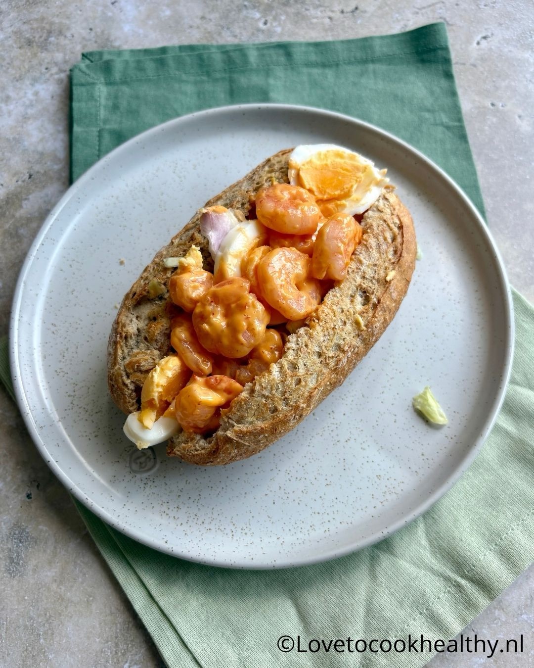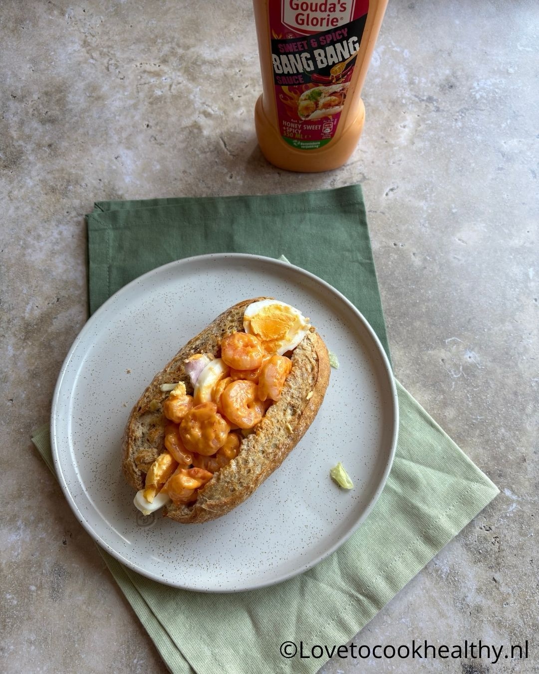 - Meng de garnalen met de Bang Bang Sauce en leg op de sla en ei in het broodje.