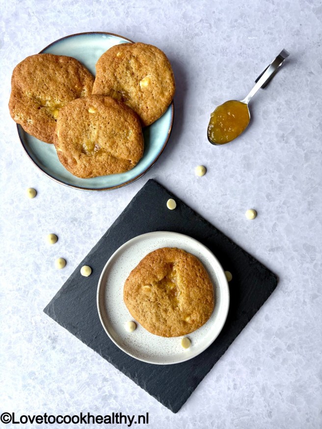 Deze gevulde chocolate chip cookies met witte chocolade zijn een lekkere variant op de chocolate chip cookies die al op de site staan. Ik maakte ze met de Meer Fruit, Minder Suiker Ananas Passievrucht van Bonne Maman en de witte chocoladedruppels van de Noototheek.