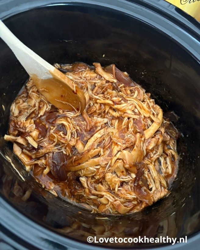 – Roer de pulled chicken door de saus en klaar is je pulled chicken.