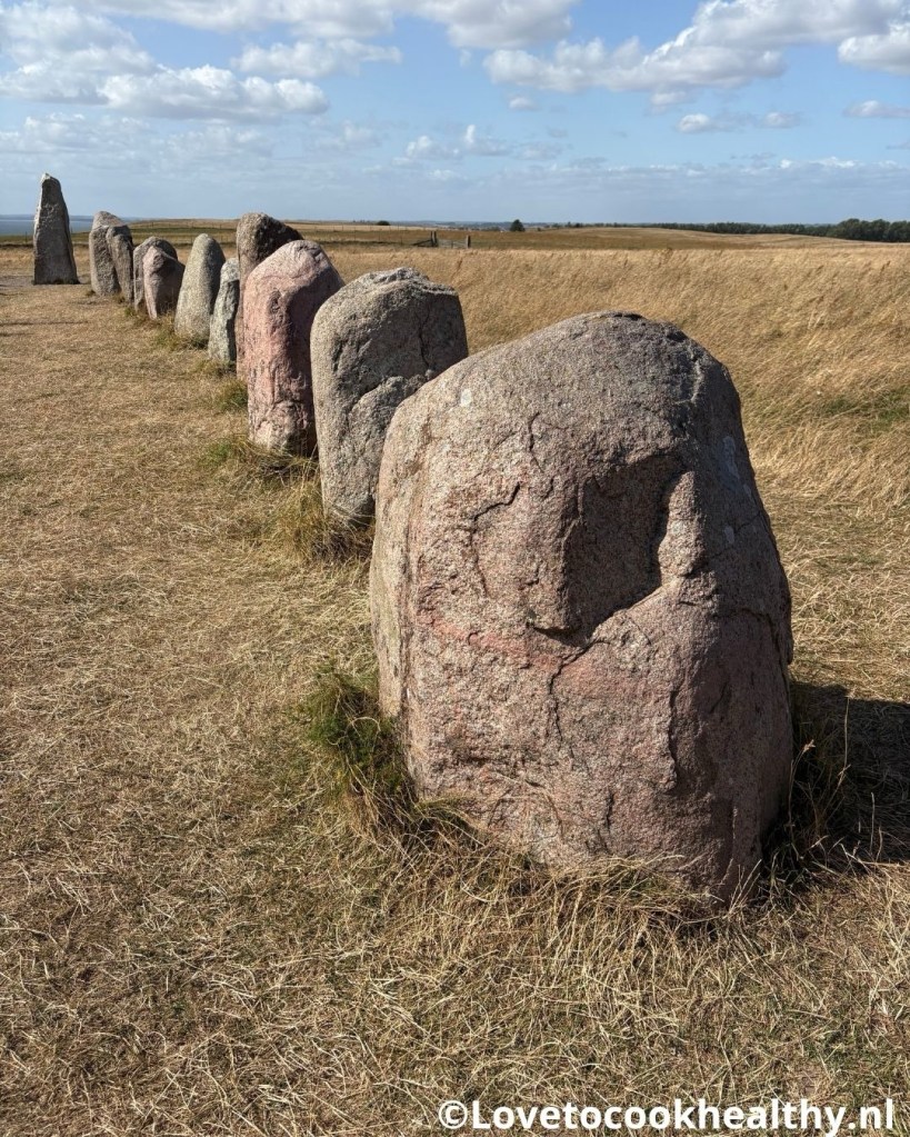 Als laatste gaan we Ales Stenar bezoeken, hiervoor moeten we weer terug naar Ystad en dan nog een half uur rijden. We parkeren in het haventje en lopen dan naar boven naar de 59 stenen die in de vorm van een schip zijn neergezet. Men weet nog steeds niet waarvoor het dient, maar het is wel interessant om te zien. We hebben prachtig uitzicht op de Baltische zee.
