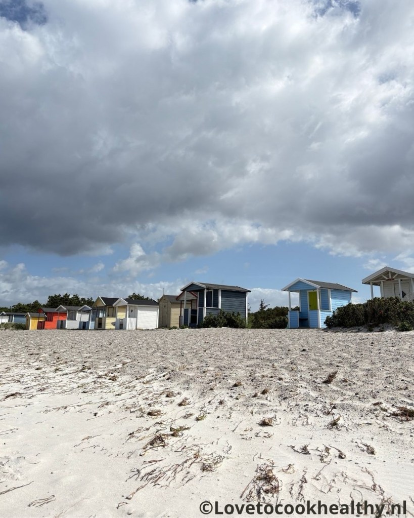 We worden wakker met een blauwe lucht, maar het waait wel heel hard. We willen vandaag naar Falsterbo om daar het strand met de houten badhuisjes te bezoeken. Dit stuk Zweden staat ook wel bekend als de Zweedse Riviera. We rijden om tien uur weg en komen daar om elf uur aan en parkeren vlakbij het natuurreservaat. Daar kun je een uur gratis staan. Het waait nog steeds hard en we trekken onze softshell jassen aan. Het is een korte wandeling naar een aantal huisjes en Emily vermaakt zich prima op het mooie strand. Het zand is fijn en wit, maar door de woeste zee ligt er heel veel zeewier op het strand. Er zijn kitesurfers die volop gebruik maken van de wind en het is een mooi gezicht.