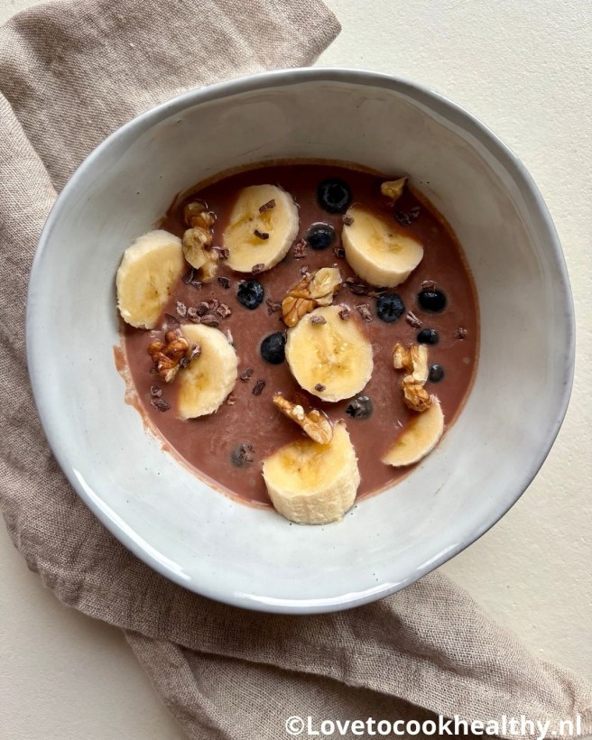 – De volgende ochtend roer je de overnight oats door elkaar en maak je deze af met de plakjes banaan, cacaonibs, blauwe bessen en stukjes walnoot.