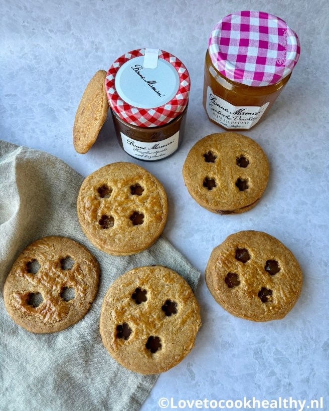 Ik gebruikte een ronde koekvorm en een uitsteker in de vorm van een bloem om de gaatjes in de bovenkant van de koeken te maken. Door de grootte van de ronde koekvorm haalde ik 20 koeken uit het beslag en dat zijn dus 10 sandwichkoeken. De hazelnootpasta en jam smeer je vlak voor het serveren op de koeken anders worden ze snel zacht. Bewaar de niet-besmeerde koeken in een luchtdichte koektrommel.