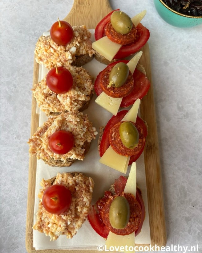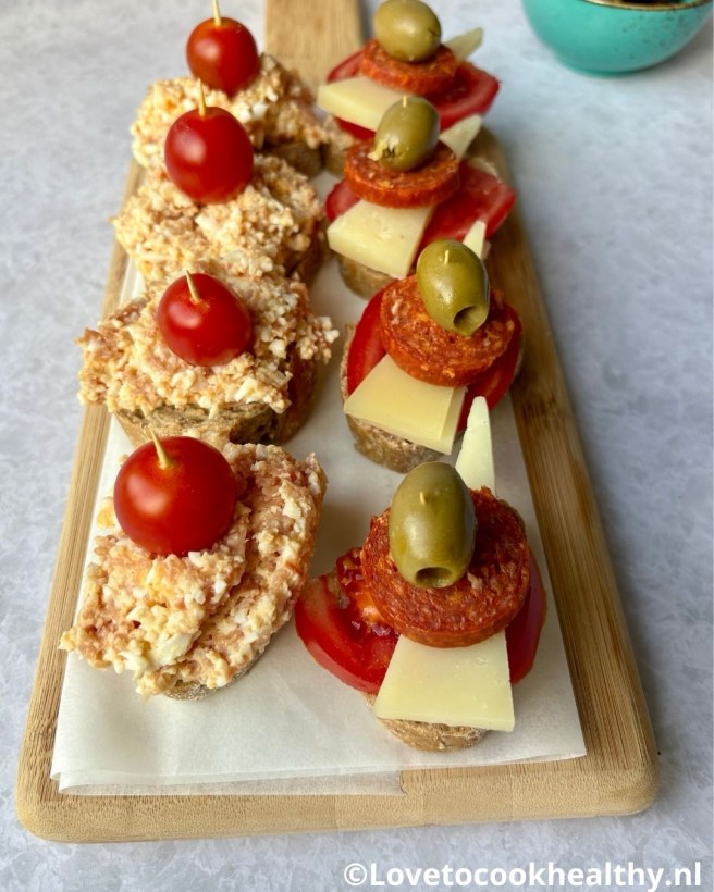 – Voor de pintxos met manchego kaas, tomaat, chorizo en olijven: