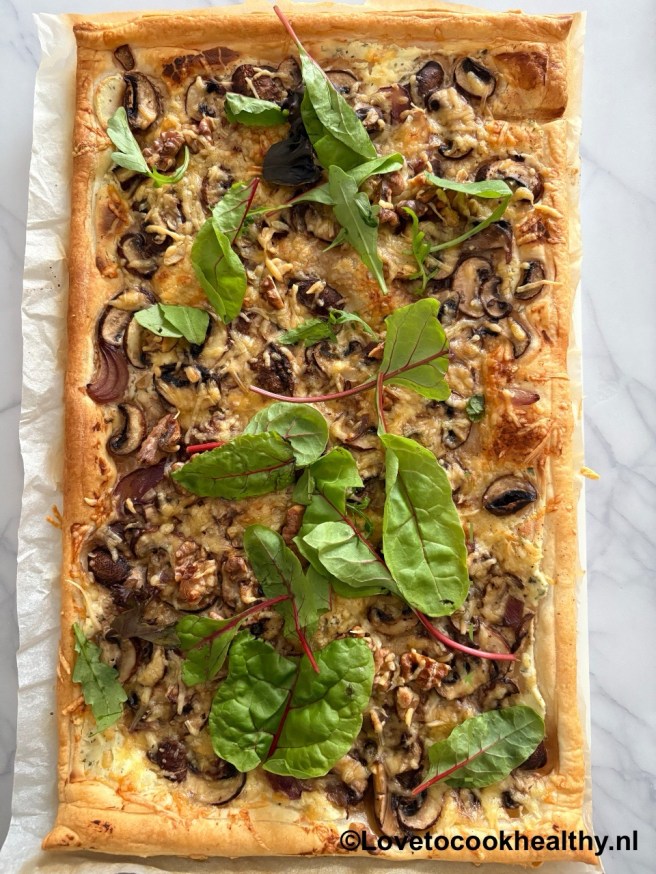 – Verdeel de champignons, knoflook en ui over de kruidenroomkaas.
