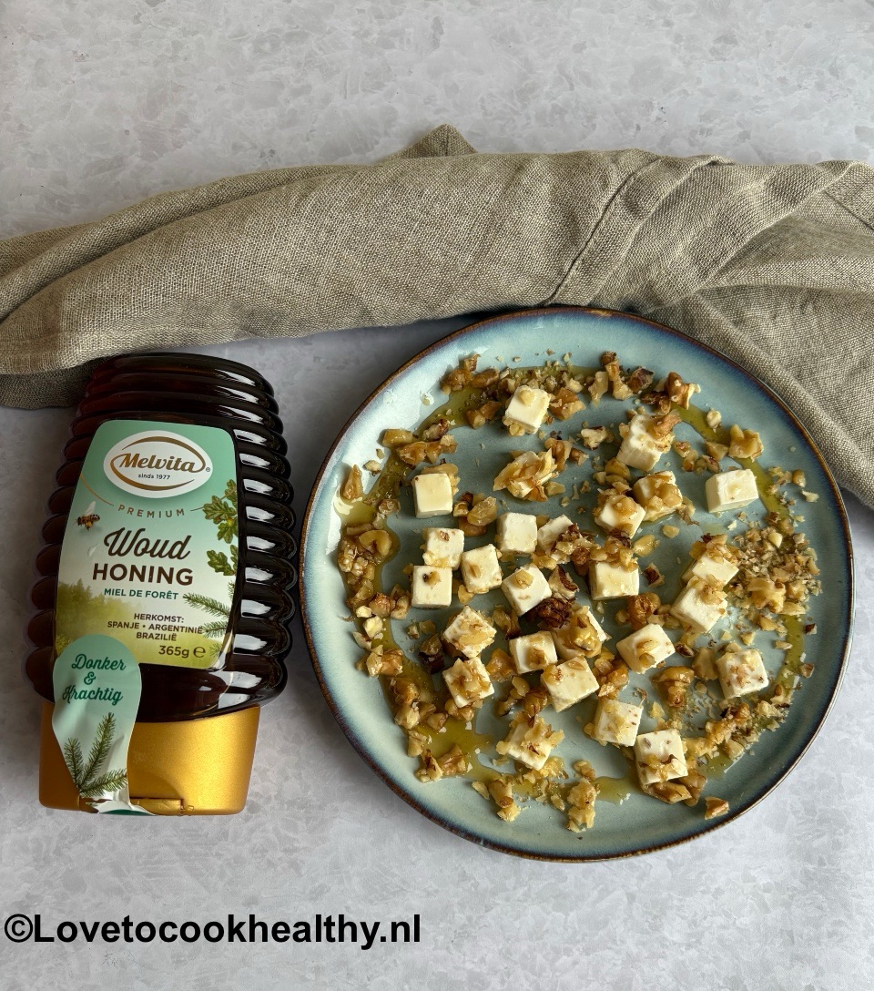 Sommige ingrediënten passen zo goed bij elkaar dat ze bijna niks nodig hebben om te shinen. Zo ook honing en witte kaasblokjes.